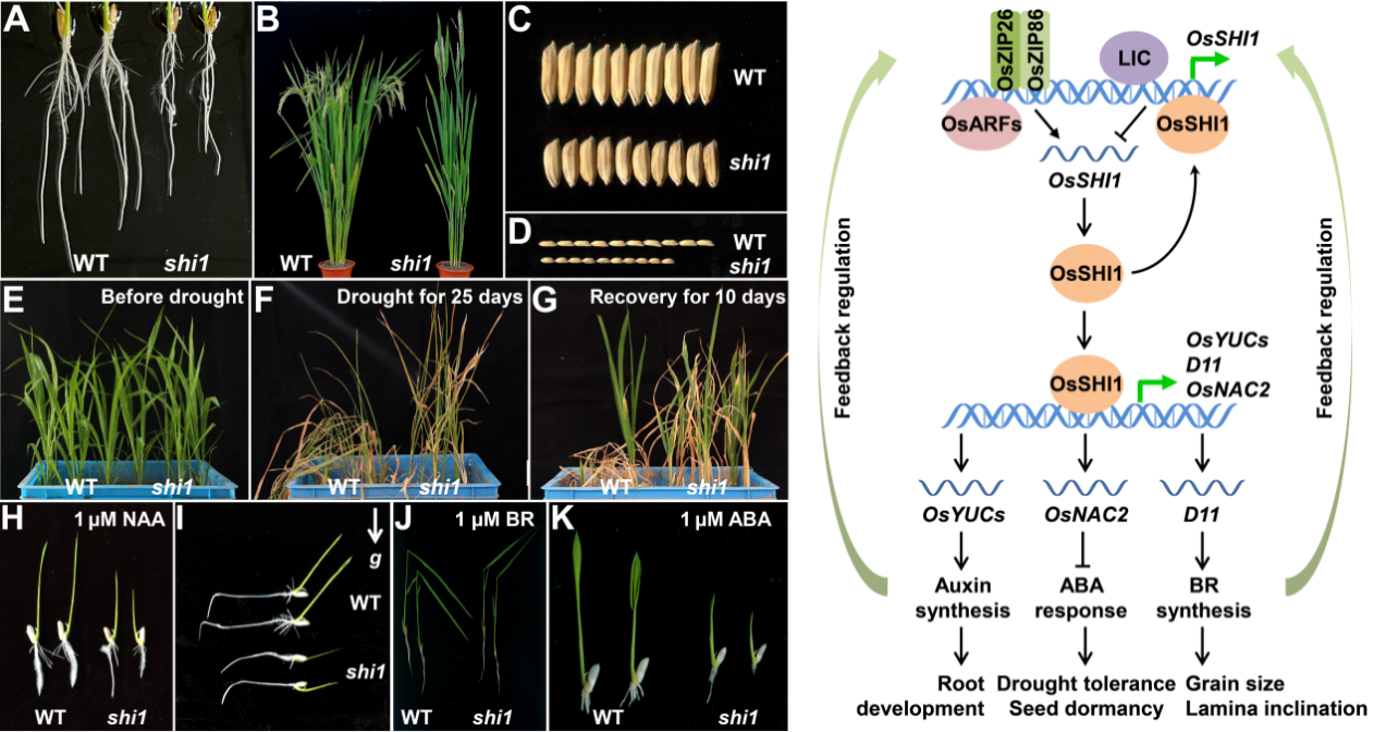 在前期研究中,该团队通过一个水稻株型发育突变体 shi1 ( short internode1 )克隆了水稻株型发育调控基因 OsSHI1 ,并初步阐明其通过影响 IPA1 转录活性进而控制水稻分蘖及穗分枝的分子机制(The Plant Cell,2019)。本研究进一步发现, shi1 突变体表现出对生长素敏感性降低、对油菜素内酯不敏感以及对脱落酸高度敏感等激素表型。生化研究发现,OsSHI1可以直接调控生长素、油菜素内酯合成相关基因如 OsYUCCAs 和 D11 以及脱落酸信号调控基因 OsNAC2 表达,最终实现对三类激素信号的调控。反之,上述激素也可通过其关键响应因子如ARF、bZIP及LIC等来调控 OsSHI1 的表达。此外,OsSHI1也可直接抑制自身编码基因的转录。这些结果表明,OsSHI1作为一个转录调节中枢,通过整合多种植物激素的生物合成与信号转导以及它们之间的反馈调节,最终协调水稻生长及耐逆过程。该研究成果为协同改良农作物株型及耐逆性提供了重要基因资源和理论依据。