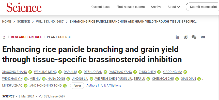 3月8日,由中国农业科学院作物科学研究所童红宁研究员领衔的研究团队,破译了国际关注近百年的水稻种质资源“复粒稻”形成的遗传基础,揭示了植物激素油菜素甾醇(BR)调控水稻穗粒数的机制,为培育高产水稻新品种提供了理论基础和新路径。研究成果以长文形式在线发表于《科学(Science)》。