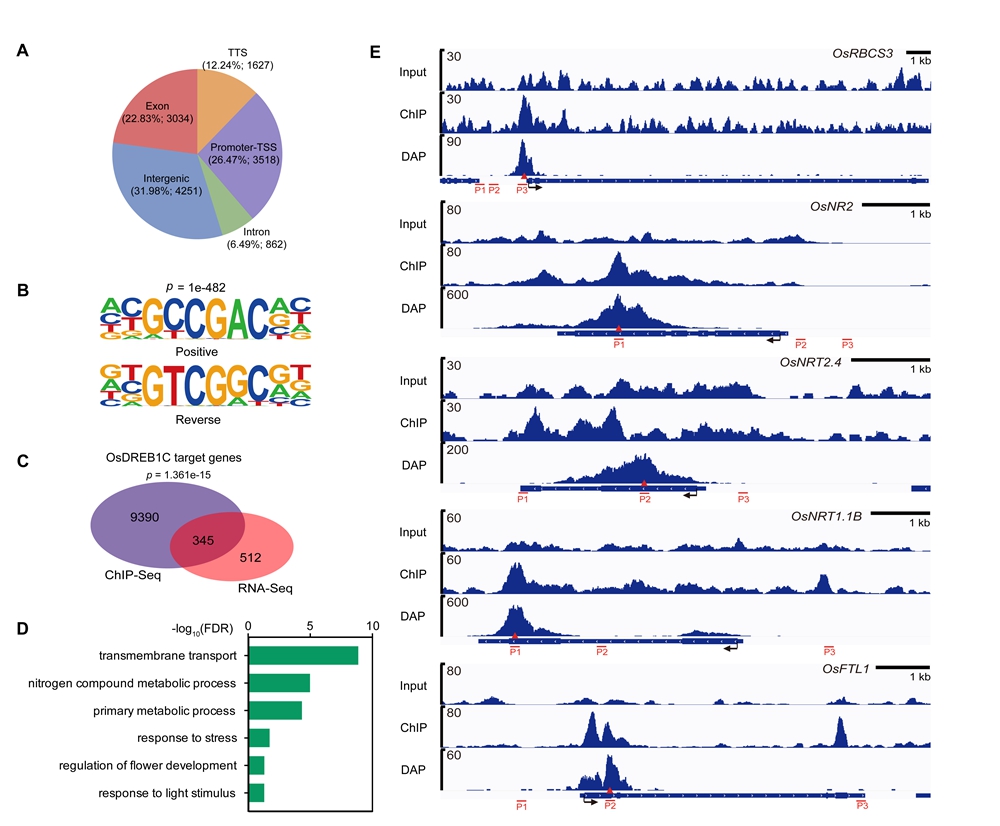 研究人员采用多种分子生物学实验手段,进一步深入解析了OsDREB1C转录因子促进水稻高产早熟的分子作用机制。研究发现,该转录因子通过分别与作用于光合作用(OsRBCS3)、氮素吸收转运(OsNRT1.1B、OsNRT2.4和OsNR2)以及开花途径(OsFTL1)的多个靶基因结合,激活这些基因的表达,进而协同调控水稻的光合作用效率、氮素利用效率以及抽穗期。