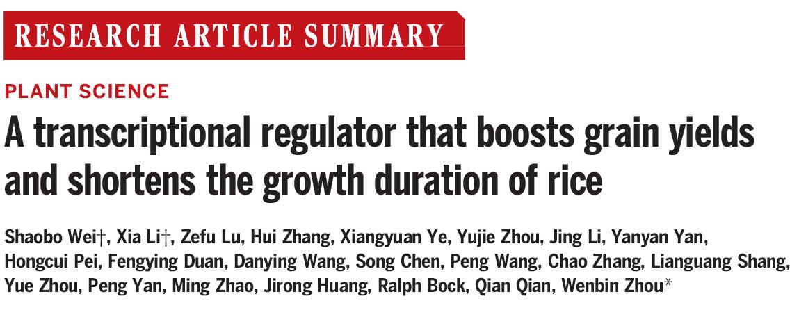 7月22日,《科学(Science)》杂志以研究长文的形式在线发表中国农业科学院作物科学研究所作物耕作与生态创新团队研究成果。科研团队从碳-氮协同调控作物产量出发,鉴定到水稻中一个重要转录因子OsDREB1C,发现该转录因子可同时提高水稻光合作用效率和氮素利用效率,显著提高作物产量。此外,OsDREB1C可使水稻提前抽穗,实现高产早熟。