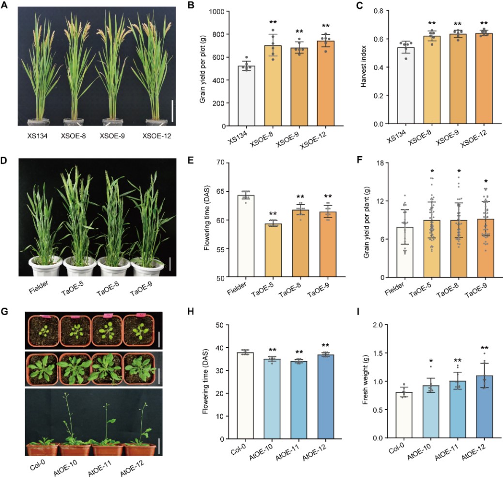 此外,研究人员还在普通小麦品种(Fielder)以及模式植物拟南芥(Col-0)中进行了多物种验证,发现在小麦中增强表达后可使小麦田间增产17.2~22.6%,早熟3~6天,说明该基因在不同作物中均具有提高产量、促进提前抽穗的保守性功能。