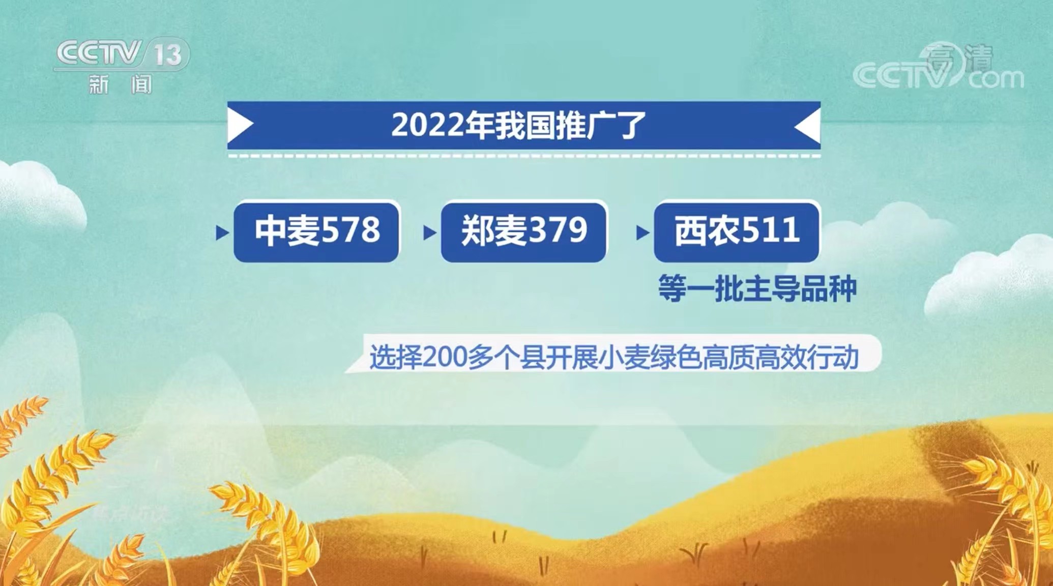 中麦578在黄淮麦区去年大面积晚播情况下仍然表现突出,各地喜获丰收。6月13日,河北省种子管理站组织专家,对河北金沙河种植合作社万亩片中麦578进行实打验收,平均亩产740公斤,较2021年的676公斤增产9.4%,还超过了大丰收之年2020年的737公斤,创造了优质强筋麦大面积高产记录。6月22日,中麦578作为优质麦品种代表登上央视1套《焦点访谈——来之不易的丰收》节目。