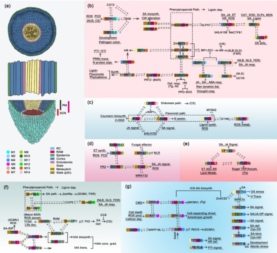 研究人员利用Fv侵染抗、感茎腐病的玉米自交系根尖,通过对原生质体进行单细胞测序,共鉴定出玉米根部7个主要细胞类型。对抗、感材料不同细胞类型中Fv侵染响应基因分析,发现玉米根尖主要细胞类型通过多种抗病信号途径应对Fv入侵并鉴定了12个Fv响应关键调控模块。对根尖顶端分生组织中差异表达的ZmWOX5b和ZmPIN1a基因在抗病分子信号途径中的功能研究发现,该基因通过调节吲哚乙酸生物合成,在根尖中形成吲哚乙酸浓度梯度,促进玉米根系伸长来保护根尖顶端分生组织免受Fv侵染。结合整合生物信息学及机器学习等方法构建了6个玉米根尖细胞类型特异性的免疫调控网络。总之,该研究不仅提供了玉米根系发育过程中细胞命运决定的全局视角,还从单细胞水平上深入解析了玉米根尖主要细胞类型的免疫调控网络,从而为阐明玉米抗病分子机制和抗病育种奠定了基础。