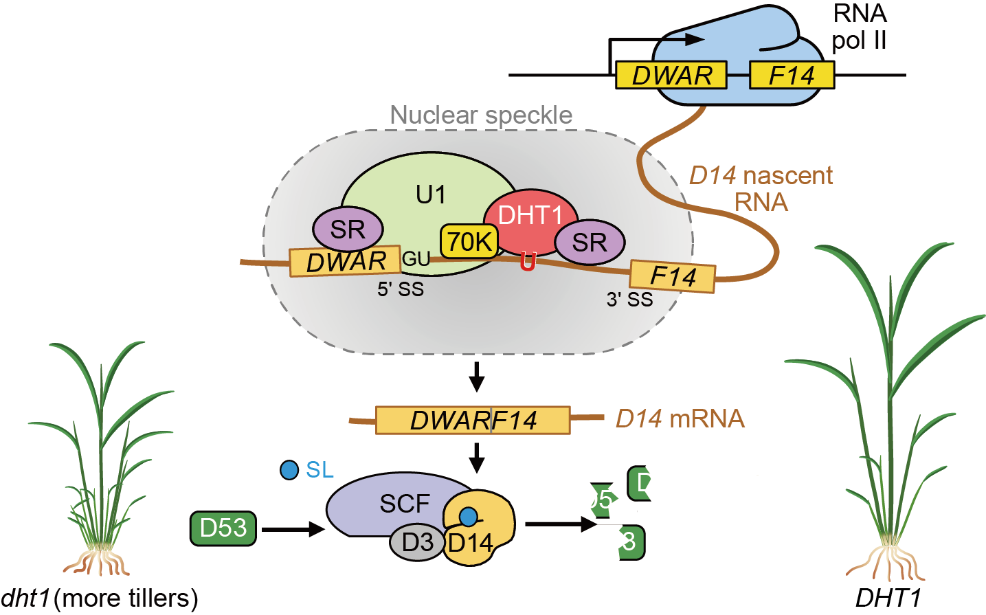 万建民院士团队以一个矮秆多分蘖的水稻突变体dht1为材料,通过图位克隆的方法鉴定了DHT1基因编码一个新的单子叶植物特有的核不均一性核糖核蛋白,该蛋白参与调节大量基因的前体信使核糖核酸(包括独脚金内酯受体基因D14)的内含子剪接。dht1突变导致D14前体mRNA转录和剪接受阻,减少D14蛋白,阻碍了独脚金内酯的信号传递,最终导致独脚金内酯信号通路的抑制因子D53蛋白积累,促进了分蘖。研究揭示了通过调控独脚金内酯受体基因D14的转录和剪接来调控水稻分蘖的新通路,为水稻株型改良提供了新启示。