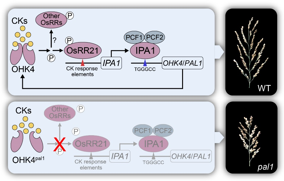 该研究从淮稻5号的辐射突变体库中筛选到一个短穗突变体,该突变体穗子变短,一级枝梗数、二级枝梗数和穗粒数均降低。与野生型相比,该突变体的顶端分生组织变小,进入生殖生长期后,枝梗原基数也减少。研究发现,控制该性状的候选基因编码细胞分裂素受体OHK4,在突变体中,OHK4发生了两个氨基酸的缺失,使其不能二聚化,导致其对细胞分裂素的结合能力降低。进一步研究发现,转录因子OsRR21在突变中对细胞分裂素的磷酸化响应减弱,并且已报道的穗型调控基因IPA1能够被OsRR21转录激活调控。另外还发现,转录因子IPA1能够激活OHK4的表达。以上研究表明,OHK4-OsRR21-IPA1在水稻穗发育中形成一个正反馈调控环,这一结果阐明了细胞分裂素信号调控水稻穗型的重要机制,为水稻穗型改良提供了新的理论基础和基因资源。