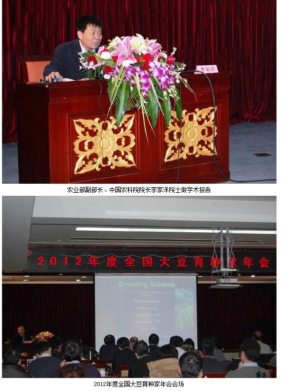 由国家大豆产业技术研发中心和中国作物学会大豆专业委员会联合举办的“2012年度全国大豆育种家年会”于2012年1月15-16日在北京召开。农业部副部长、中国农业科学院院长李家洋院士出席会议并做学术报告。来自全国18个省(市、自治区)45个科研单位、高等院校、推广部门、种子企业的领导、专家和科技人员共110位代表参加了会议。