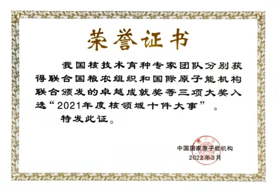 6. 我国核技术育种专家团队分别获得联合国粮农组织和国际原子能机构联合颁发的卓越成就奖等三项大奖