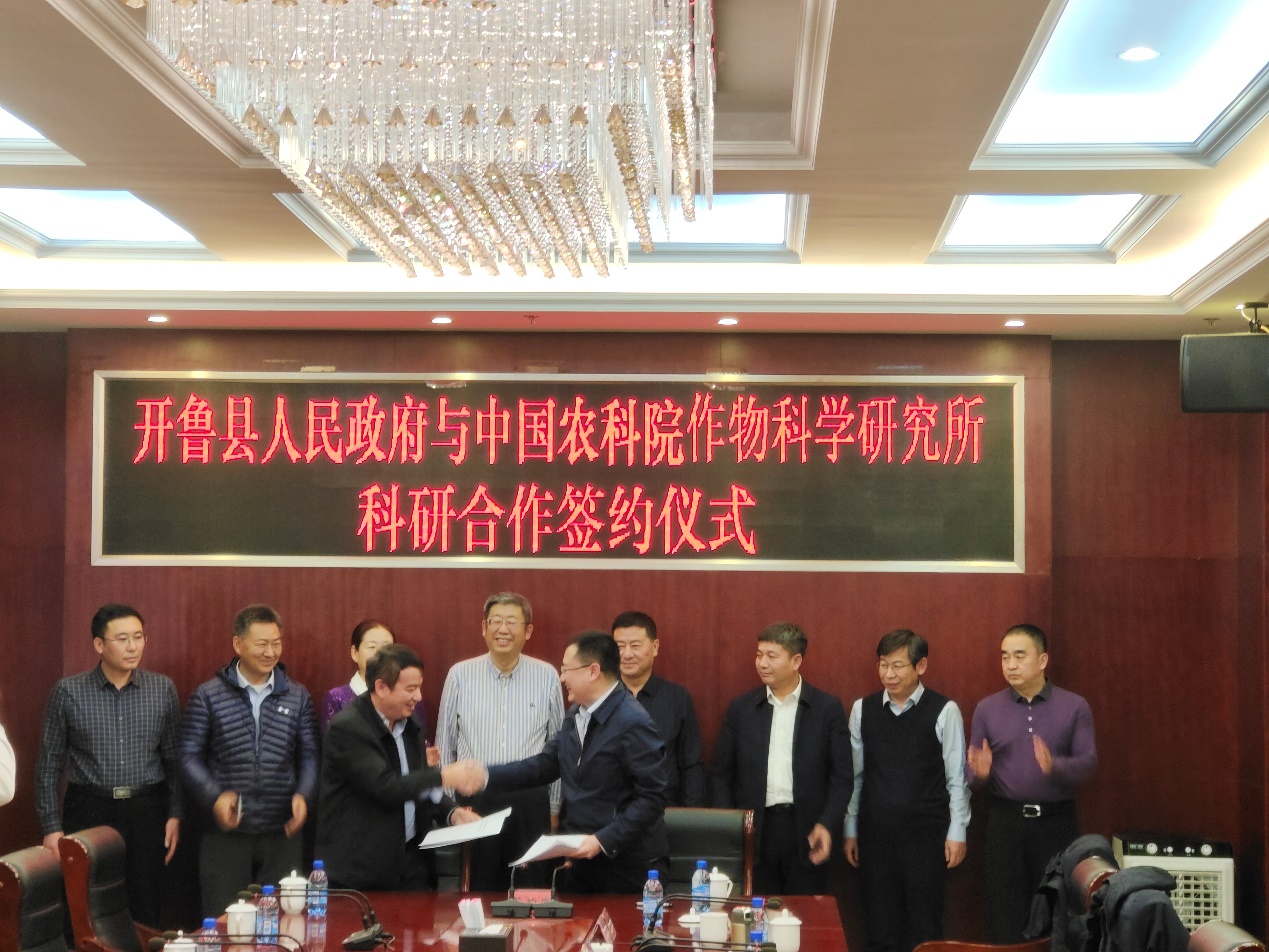 12月28日,中国农业科学院作物科学研究所与开鲁县人民政府正式签署科技合作协议,双方将共同推进玉米密植高产技术等优秀科研成果转化应用,带动提升开鲁县和周边地区玉米种植业发展和乡村振兴。所长钱前院士和开鲁县县长刘洋、通辽市农牧局副局长马俊岭等领导出席签约仪式。钱前院士和刘洋县长代表双方签约。