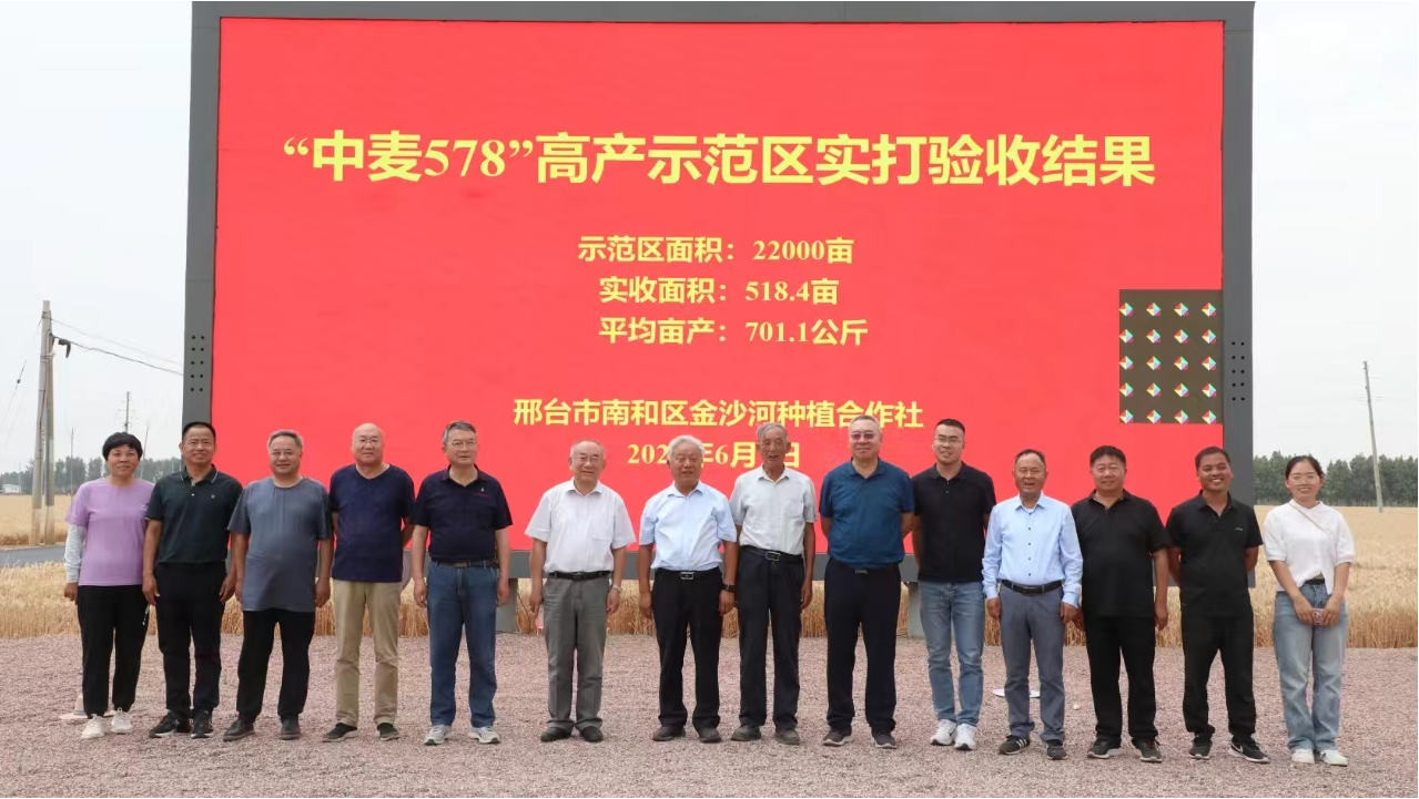 6月7日,河北省邢台市南和区闫里乡金沙河种植合作社的2.2万亩“中麦578”进行实收测产,该万亩区集中种植中国农业科学院选育的高产、优质、强筋、广适小麦新品种“中麦578”。本次实收测产依据农业农村部相关测产办法执行,实际收获面积518.4亩,折算标准含水率后平均亩产达701.1公斤,创下了我国一年两熟区优质强筋小麦大面积(500亩以上)实收的高产纪录。