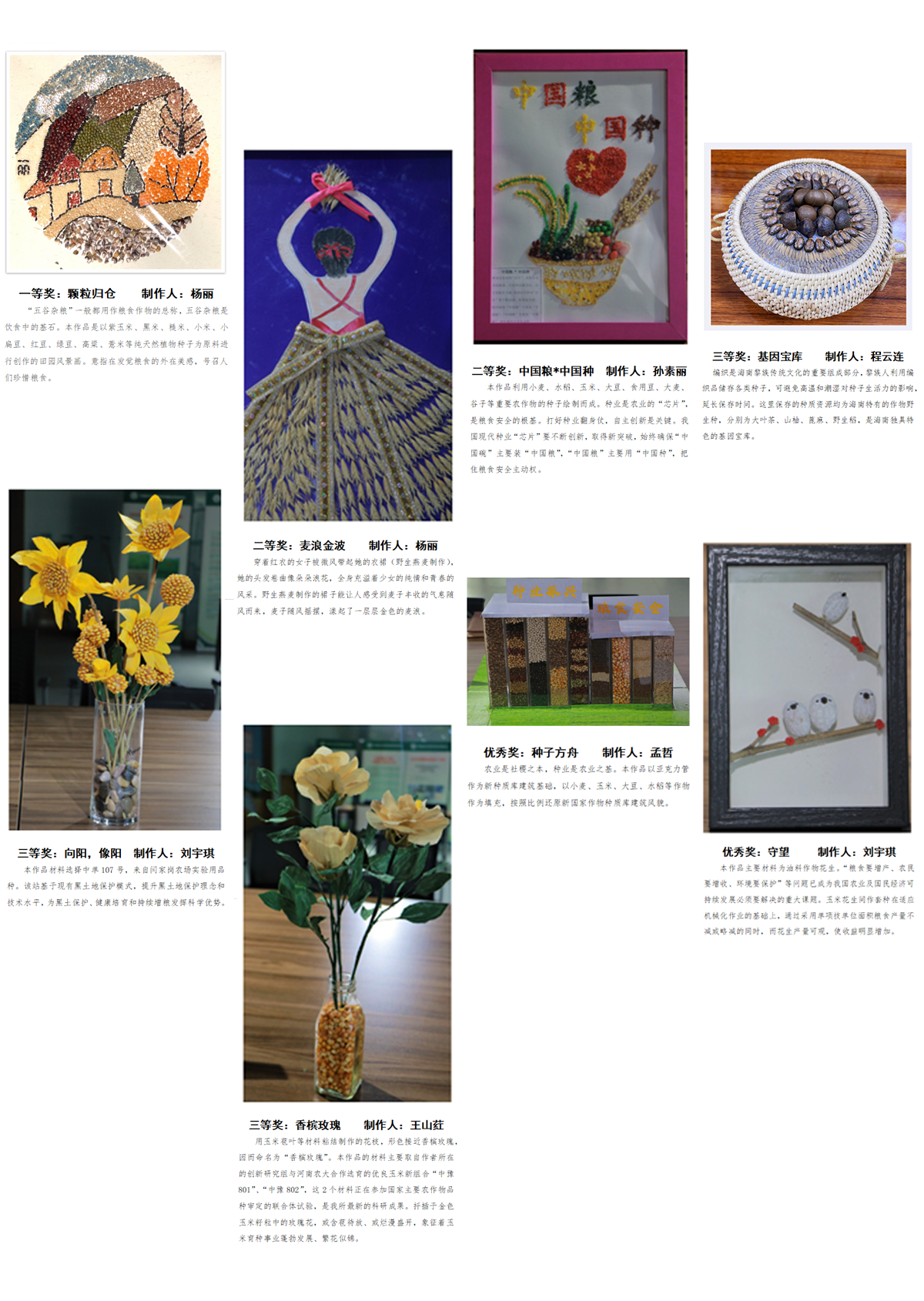 本届农作物创意手工艺品的比赛注重科技含量,兼顾美感设计。因不同作物成熟期不同,此次活动收取作品历时近一年,共收集8件内容丰富、做工精巧、创意独特的作品,涵盖了小麦、玉米、大豆、水稻、杂粮等多种农作物。评委根据作品的科技含量、作品创意、艺术鉴赏三项评分指标,经专家评定,评选出一等奖1名,二等奖2名,三等奖3名,优秀奖2名。