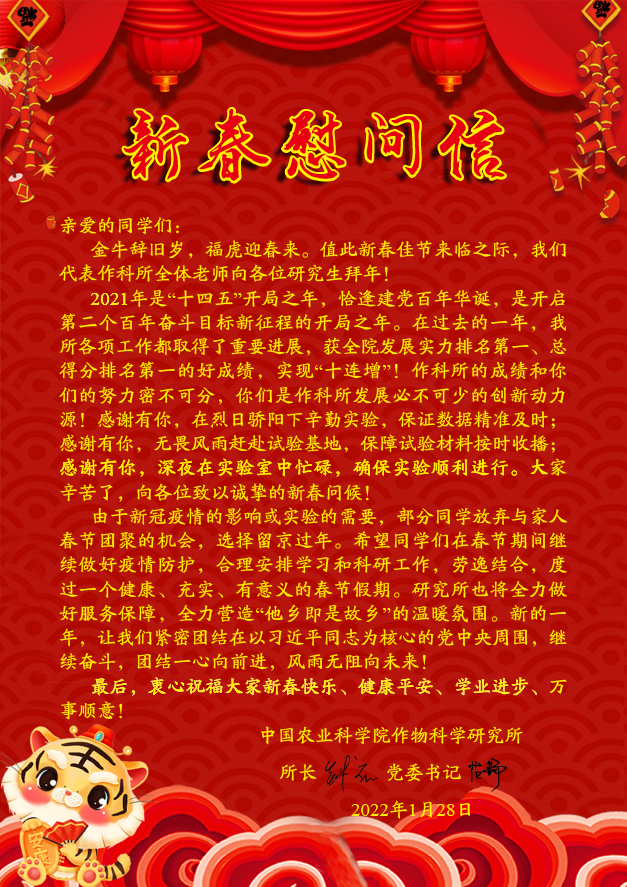 在2022年虎年春节来临之际,所长钱前、党委书记范静代表所领导班子向春节期间在京就地过年的所有同学致信,向同学们表示关怀慰问,并给同学们送上新春的美好祝福。