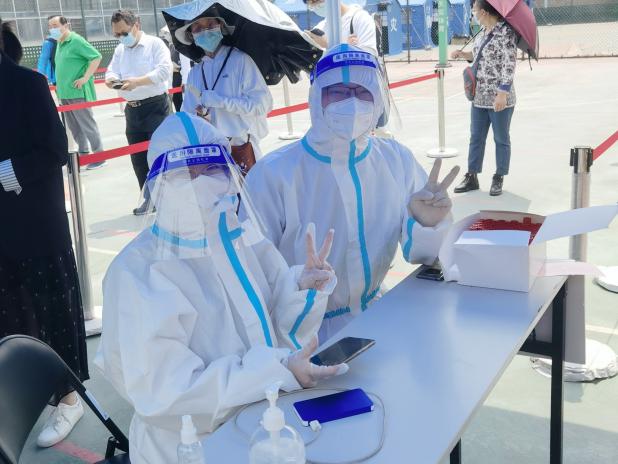 此次志愿服务主要是在核酸采集点开展身份信息采集、录入等工作。通过微信群,志愿者们提前下载软件,学习信息采集流程和注意事项,相互交流扫码经验。志愿服务当天,提前四十分钟到达采样点开始准备,确保准时开展工作,减少居民排队时间。入夏的北京,骄阳似火,志愿者们穿着密不透风的防护服,戴着N95口罩和防护面罩,克服汗水浸湿衣衫、眼镜起雾等种种不适,抓紧时间高效工作。面对不把身份证放在桌上的居民,他们就抬起手扫描,做好“隔离”;遇到没有身份证的小朋友或外籍留学生,他们就一点一点手动录入;对姓名中有生僻字的居民,在扫描后仔细核对姓名识别的是否准确,发现错字及时更改、手动录入;对乘坐轮椅的居民或小朋友,主动站起身来拿取身份证;在沟通中时刻注意使用“请稍等”“好的,可以了”等词语,尽量照拂大家的情绪。