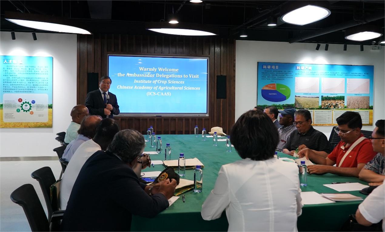 刘录祥向考察团详细介绍了作科所核辐射与航天诱变育种的技术创新、突变基因发掘与利用、突变品种选育与推广、国际合作交流等方面的进展情况,尤其是亚太植物突变研究协会(AOAPM)和植物诱变育种协作网(MBN)等国际交流平台建设情况和下一步工作计划。大使们高度赞赏了作科所在作物核辐射育种领域所取得的成就,对核技术在加快作物育种、保障粮食安全等方面的良好实践表达了浓厚兴趣,纷纷表示将积极响应国际原子能机构和联合国粮农组织关于“原子用于粮食安全”(Atoms4Food)倡议,希望作科所持续加强与广大发展中国家合作,共同推动核技术在农业中的广泛应用。