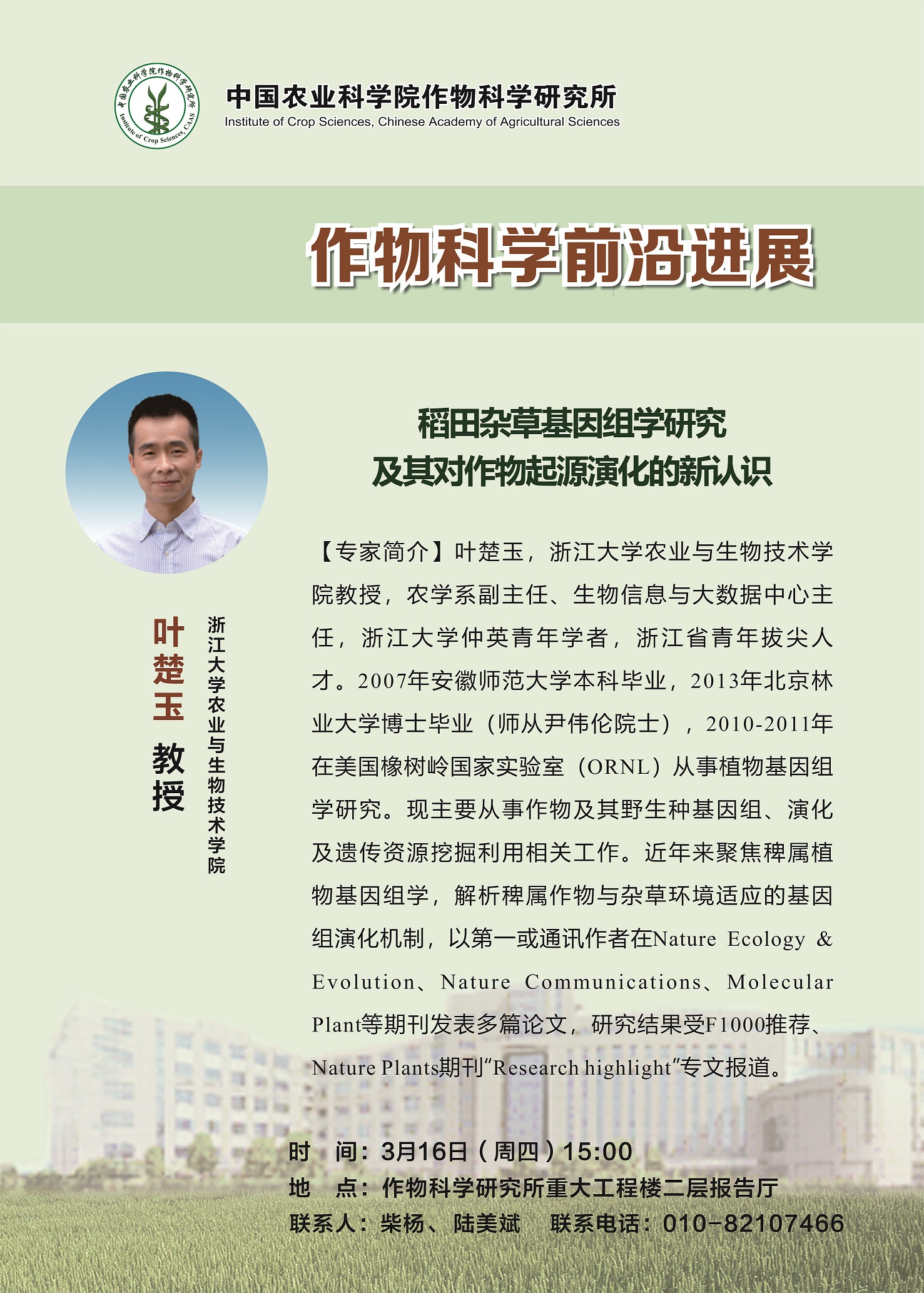 【作物科学前沿进展】叶楚玉 教授 稻田杂草基因组学研究及其对作物起源演化的新认识
