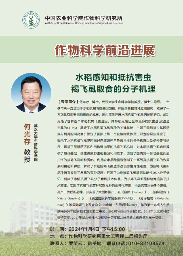 【作物科学前沿进展】何光存 教授 ,水稻感知和抵抗害虫褐飞虱取食的分子机理