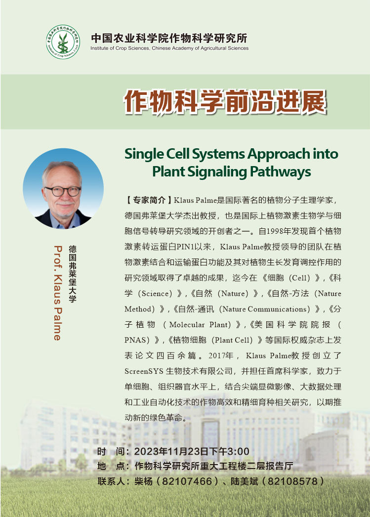 【作物科学前沿进展】Klaus Palme ,Single Cell Systems Approach into Plant Signaling Pathways