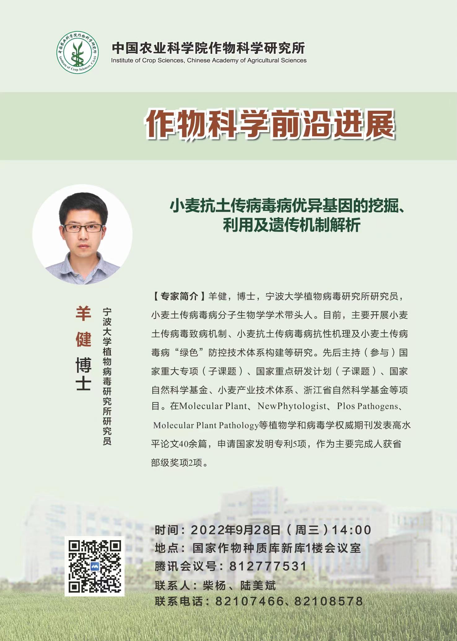 【作物科学前沿进展】羊健 研究员 小麦抗土传病毒病优异基因的挖掘、利用及遗传机制解析