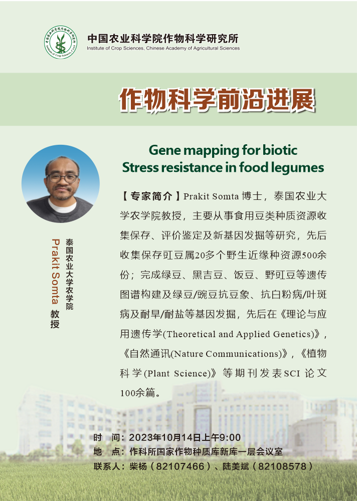 【作物科学前沿进展】Prakit Somta , Gene mapping for biotic stress resistance in food legumes