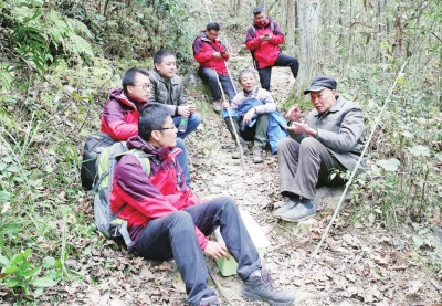 70岁的湖南省石门县壶瓶山巡护员杜凡章在路边给第三次种质资源普查队员讲解植物特性。