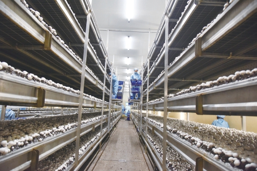 在江苏省徐州市睢宁县官山镇,江苏众友兴和菌业科技有限公司的生产车间内,工作人员正在采摘双孢菇。双孢菇的基料由秸秆制成,是菌菇种植生长的“天然温床”。 官山镇政府供图
