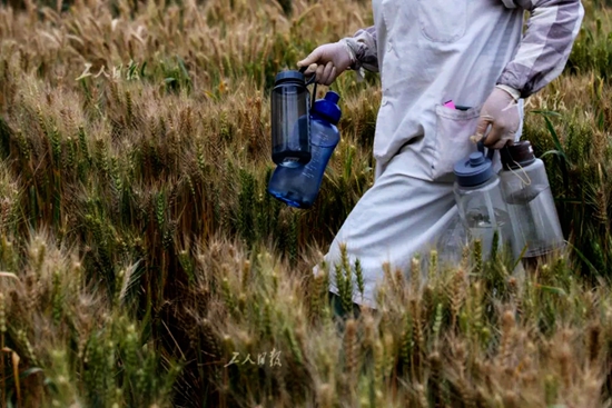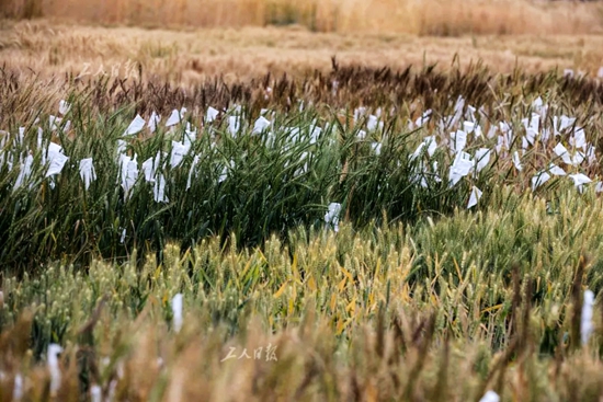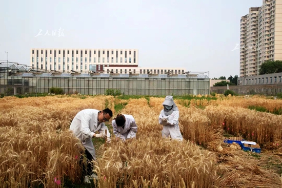6月7日,位于北京北三环内的农科院试验田内,科研人员为创制小麦新种质,开展大规模杂交,数以千计的白色杂交袋在风中摇曳。