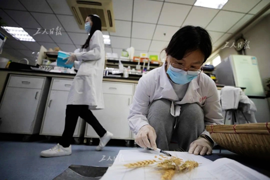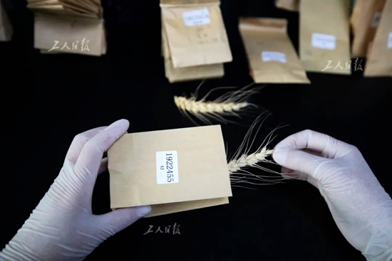 6月17日,农科院作科所的实验室内,一名工作人员正小心翼翼地将烘干的麦穗从袋子中取出。为了保证数据的准确,麦穗粒数和麦芒都要完好无损。