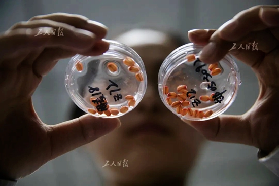在顺义基地,像毛新国这样的科学家随处可见。单从外表看,他们和普通农民完全没有区别,只有当他们穿上白色大褂,在田间指指点点,在本上勾勾画画才会“暴露”他们的身份。