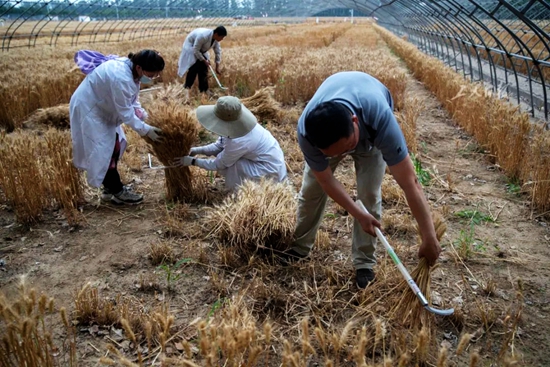 6月7日,位于北京北三环内的农科院试验田内,来自作科所的研究员赵林姝(右一)正和工作人员在收小麦试验材料。