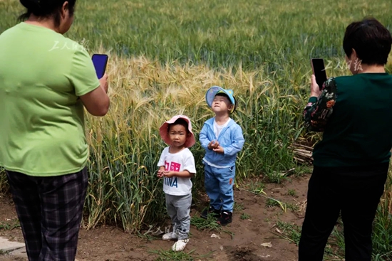 6月15日,农科院作科所顺义基地的麦田里,附近的村民带着小孩在麦田里拍照留影。每年小麦成熟的时候,成片的麦田总能吸引不少人到此“打卡”。