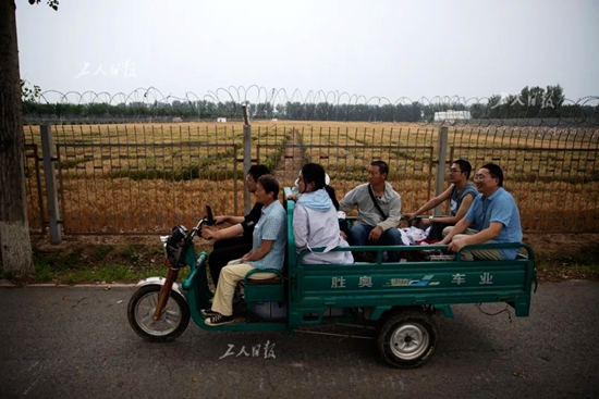 6月15日,农科院作科所顺义基地,结束了一天的工作后,毛新国(右一)和工作人员一起乘坐三轮车返回住所。