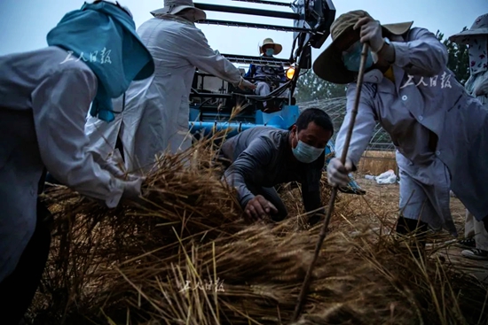 6月21日傍晚,农科院作科所顺义基地的麦田里,工作人员正将收割下来的小麦送进收割机脱粒。