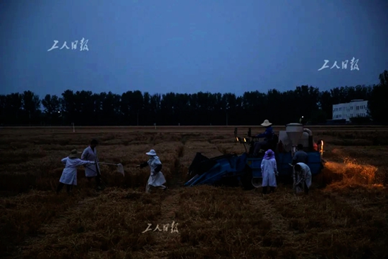 6月21日晚,农科院作科所顺义基地的麦田里,工作人员正在抢收小麦。