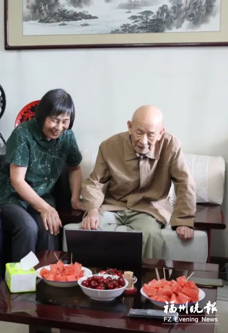 去年,庄巧生(右)和庄文颖(左)在北京家中观看五都村宣传视频。