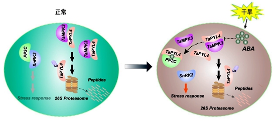 在正常条件下,MPK3对PYL4的抑制会干扰胁迫信号传递,防止胁迫响应对植物正常生长的影响;而干旱胁迫下快速产生的脱落酸可以削弱MPK3介导的PYL4的降解,从而促进脱落酸信号传递并激活植物胁迫响应。为了限制胁迫信号对植物生长的抑制或在胁迫刺激消失后迅速恢复正常生长,植物可能通过增加TaMPK3的水平从而下调脱落酸信号中PYL4的功能。该研究证实了小麦MPK3可以通过促进PYL4的降解来负向调控小麦的耐旱性,可能在小麦干旱胁迫响应与正常生长信号之间起到平衡作用。