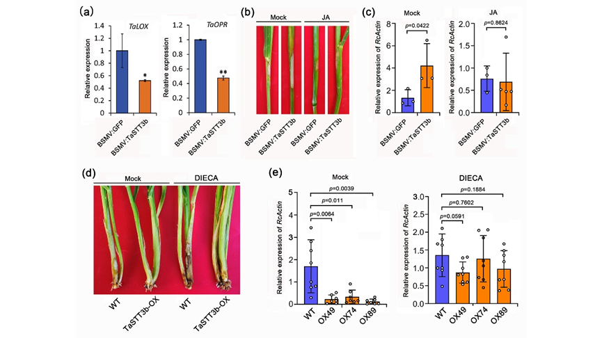 研究发现,一个位于小麦2B染色体上的寡糖基转移酶催化亚基编码基因TaSTT3b-2B受纹枯菌诱导表达。利用生物技术手段使该基因沉默显著降低了小麦对纹枯病的抗性,而过表达该基因可以显著提高抗病性。进一步研究发现,TaSTT3b-2B基因能够促进茉莉酸的合成,并且该基因表达蛋白所介导的抗病性依赖于茉莉酸信号路径。此外,还发现TaSTT3b-2B基因在不同小麦材料中的表达水平与籽粒大小呈正相关,在纹枯病侵染条件下,过表达该基因显著提高了籽粒大小。该研究为小麦抗纹枯病分子机制解析提供了新思路,同时展现了TaSTT3b-2B基因在小麦抗病遗传改良和产量提升中的潜在应用价值。