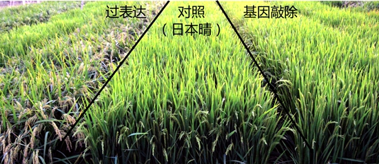 过表达材料(左)、野生型(中)、基因敲除材料(右)田间表型对比。(受访者供图)