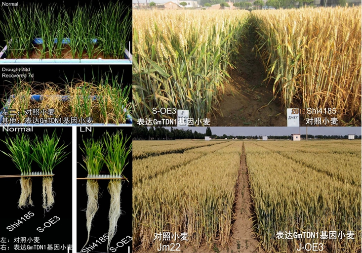研究人员从抗逆性强的大豆品种“铁丰8号”中克隆了转录因子基因GmTDN1,基因表达谱分析表明GmTDN1可以响应干旱、低氮等各种非生物胁迫,将GmTDN1导入“石4185”和“济麦22”二个主栽小麦品种,显著提高了小麦的节水抗旱性和氮肥利用效率。连续3年在3个不同地点进行的田间试验表明,导入GmTDN1基因的“石4185”和“济麦22”小麦在节水条件下和缺氮条件下产量分别提高13.0 %和24.5%。进一步研究发现,在小麦中过量表达GmTDN1基因可以上调LEA、EREBP1、WRKY46等干旱胁迫应答基因以及硝酸盐转运体基因NRT2.5的表达,增强了小麦的光合和渗透调节、抗氧化,以及根系氮素吸收能力,最终协同提高小麦的抗旱性和氮肥利用效率。