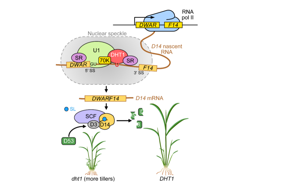 以一个矮秆多分蘖的水稻突变体dht1为材料,万建民院士团队通过图位克隆的方法,鉴定了DHT1基因编码一个新的单子叶植物特有的核不均一性核糖核蛋白,该蛋白参与调节大量基因的前体信使核糖核酸(包括独脚金内酯受体基因D14)的内含子剪接。dht1突变导致D14前体mRNA转录和剪接受阻,减少D14蛋白,阻碍了独脚金内酯的信号传递,最终导致独脚金内酯信号通路的抑制因子D53蛋白积累,促进了分蘖。
