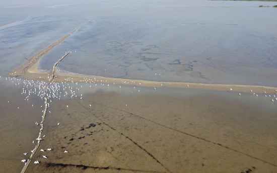 持续的高温天气,让洪泽湖水位不断下降。村干部告诉记者,夏季以来,水面的最边缘,往后退了大约数百米。记者看到,洪泽湖边,大片荷花芦苇生长的地方,已经没有水,裸露的湖底呈现出大片的灰白。