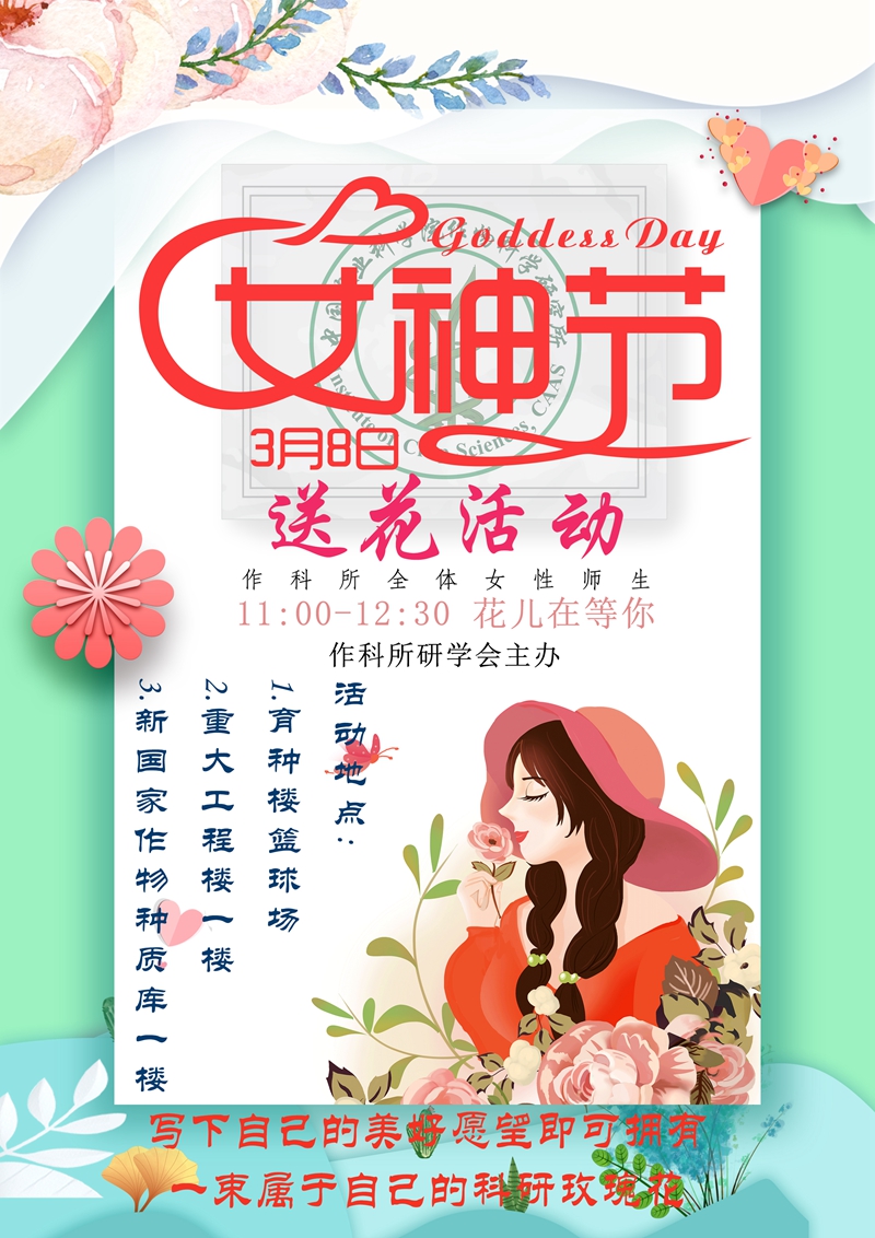 三月春风,十里桃花。万物复苏之时,专属于女生的节日也悄然而至。3月8日,为体现对在我所女性同志们的关爱,让投身科研的女神们在这个专属节日放松身心、加强交流互动,作科所研究生会在篮球场、重大工程楼和国家作物种质库新库开展了主题为“女神节快乐,幸运伴随我”献花送祝福活动。本次活动形式新颖有趣,现场气氛十分活跃热烈,有近200名女性研究生和教职工参加。